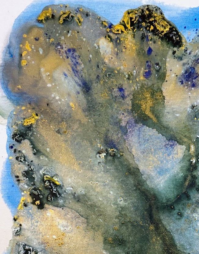 This technique creates a beautiful texture that you can almost feel with your eyes—much like the shifting, tactile landscapes we often visit in our sleep. Out of this flow, the silhouette of a tree began to emerge—a golden tree rooted in the earth but reaching for the stars. As I worked, I felt a profound sense of peaceful serenity wash over me. That is what I hope to pass on to you when you stand in front of it. In a world that can feel loud and chaotic, this painting is my "dream" of stillness.